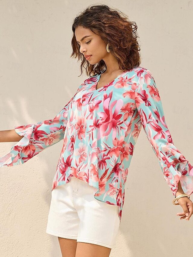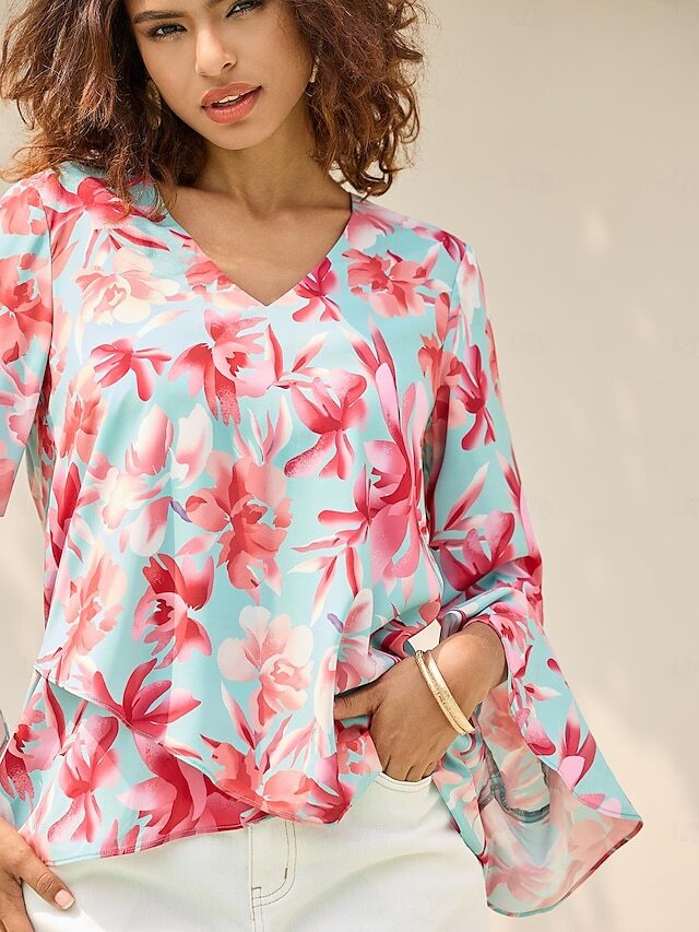 Gender:Women's, Style:Stylish, Occasion:Vacation, Tops Type:Blouse, Neckline:V Neck, Fabric:Chiffon, Design:Asymmetric, Sleeve Length:3/4 Length Sleeve, Sleeve Type:Bell Sleeve, Elasticity:Micro-elastic, Look After Me:Machine wash, Top Length:Regular, Size Suggestion:standard size, select your usual size, Pattern:Floral, Season:Spring & Fall,